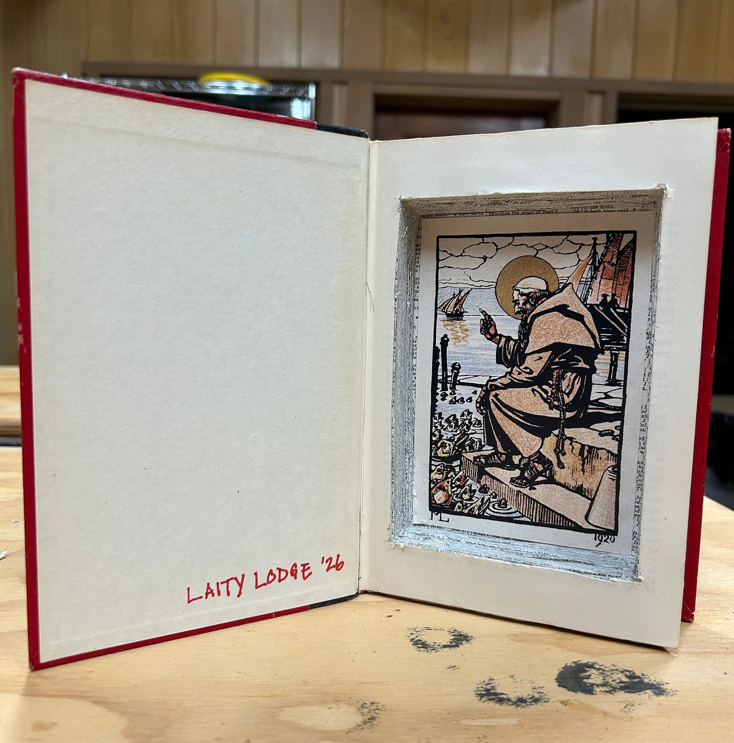 He had brought a bunch of discarded library books, glued the pages together, and then provided tools for us to “carve,” as it were, a cavity in the book in which we could then place an image. Everyone, I gather, felt an initial discomfort cutting into a book (my heart is racing as I even type that)! The fruit of the project was a miniature shrine, of sorts—a kind of icon corner framed by word (but also, I guess, the destruction of word!).